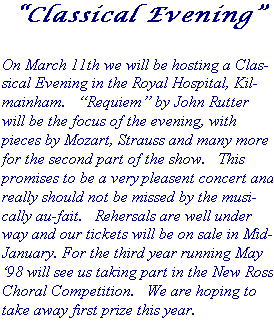 The West County Musical Society has been in existence since 1980. To date we have staged seven musicals, the most recent being "Fiddler on the Roof" which was a great success and played to packed audiences for four nights. We have performed numerous choral works in both the National Concert hall and the Royal Hospital, Kilmainham.